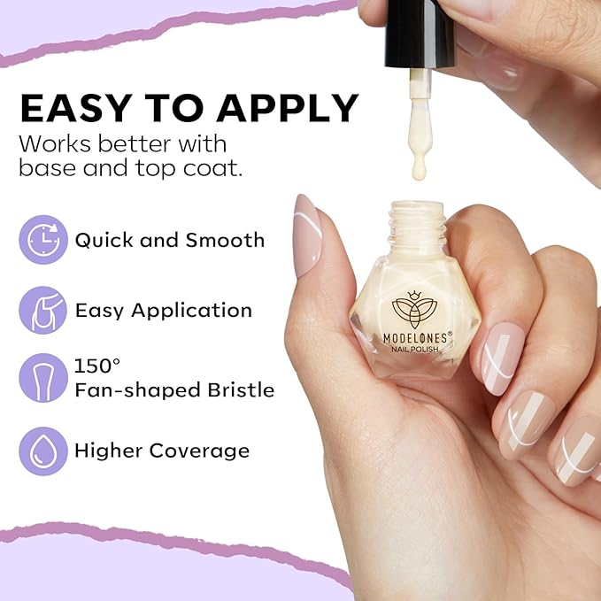- Long Last & No Chips: Modelones 6 colors nail polish has a 150° wide brush that perfectly fits your nails, ensuring easy and complete coverage. For flawless nails, we recommend applying a second coat after the first layer has dried completely. This ensures a smooth, long-lasting finish that elevates your manicure to perfection. Achieve salon-quality results at home with just two simple steps!