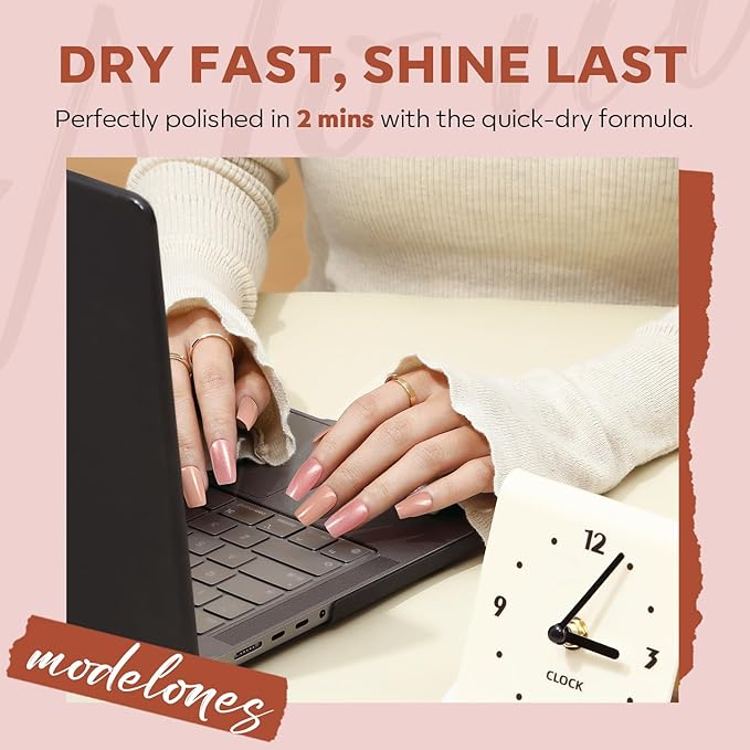 - No UV Needed & Quick Dry: Only 2 mins to get the salon look on your nails with modelones innovative quick dry formula. This nail lacquer is anti-chip and anti-peel, bringing you the long-lasting shine of more than 7 days