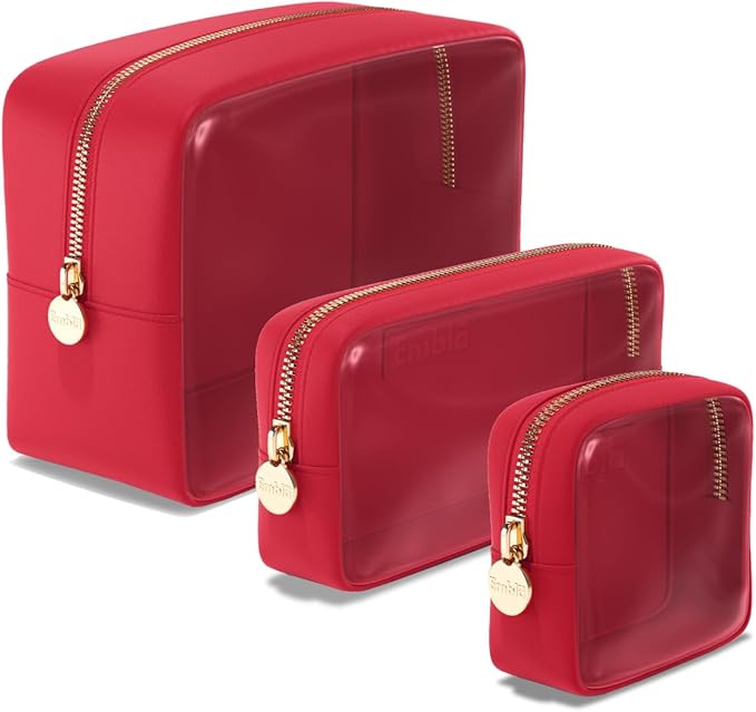 Clear Cosmetic Bags Set of 3, Mini Small Large Makeup Bags For Women Clear Pouch Cosmetics Cases Zipper Cute Pouches Make Up Travel Toiletry Essentials Preppy Purse Organizer Makeup Cases, Ruby