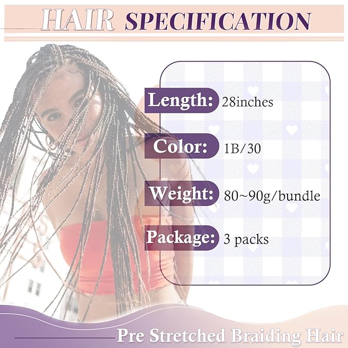 Black-Brown Pre Stretched Braiding Hair 28 Inches Synthetic Braid Hair 3 Packs Hair Braids