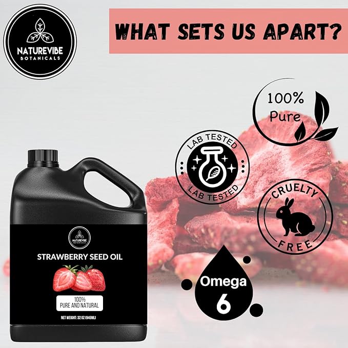 - ✅ Naturevibe’s Strawberry Seed Oil, a 100% pure cold-pressed seed oil free of fillers or additives, serves as a luxurious moisturizer for both hair and body. It's cherished by men and women alike as a staple in their daily skincare routines.