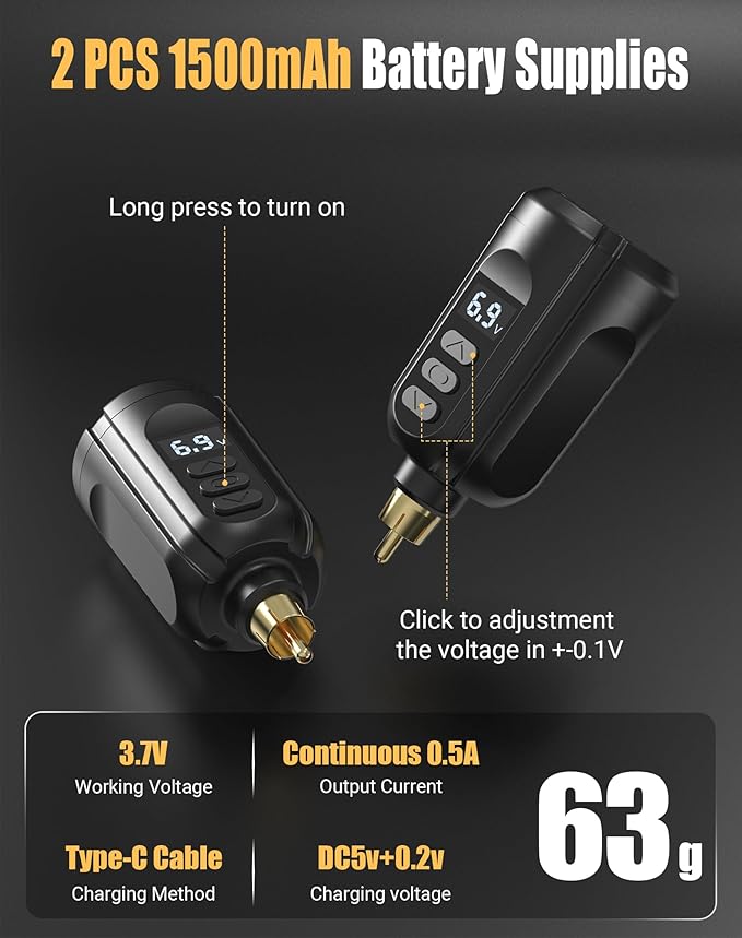 - The Cordless Tattoo Gun Contain 2 LED Batteries,New battery for 2024 with 1500 mAh,5-12V voltage can be adjusted,Two batteries can keep you tattooed without stopping.