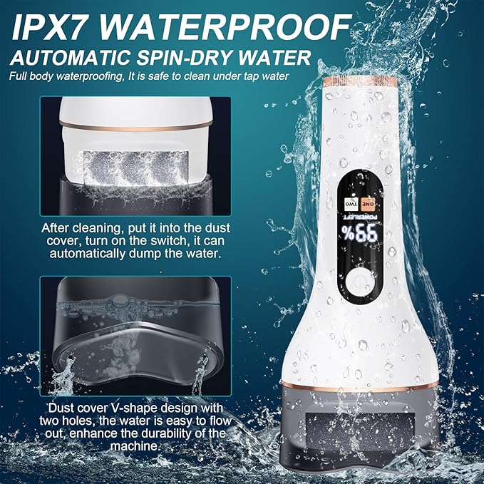 - 【IPX7 WATERPROOF -- AUTOMATIC SPIN-DRY WATER】Our dead skin remover foot grinder has IPX7 advanced waterproof grade, full body waterproof, dry and wet feet can be used, can be rinsed under the tap water; after cleaning, put it into the dust cover and press the starter switch can be automatically spin-dry water, easy to use, safe, the dust protection cover is designed with 2 small holes, so that the water is more easy to flow out, and at the same time increase the lifespan of the callus remover.