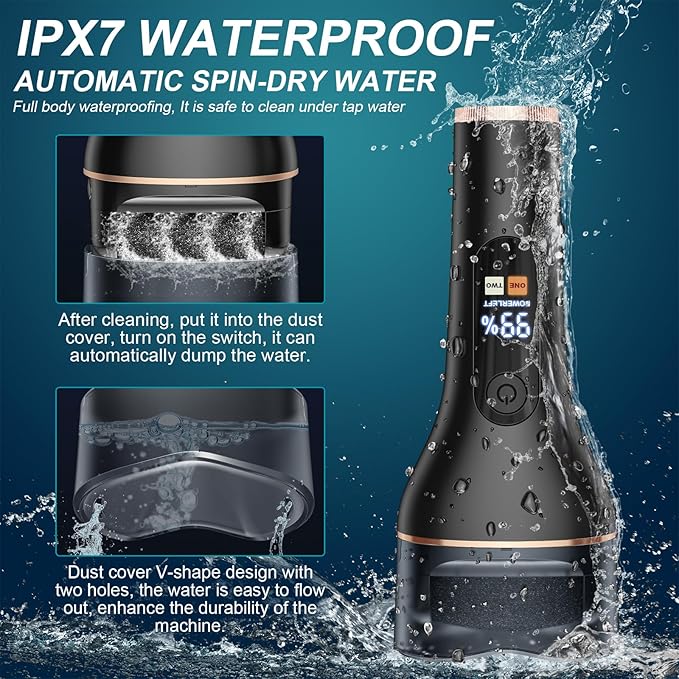 - 【IPX7 WATERPROOF -- AUTOMATIC SPIN-DRY WATER】Our dead skin remover foot grinder has IPX7 advanced waterproof grade, full body waterproof, dry and wet feet can be used, can be rinsed under the tap water; after cleaning, put it into the dust cover and press the starter switch can be automatically spin-dry water, easy to use, safe, the dust protection cover is designed with 2 small holes, so that the water is more easy to flow out, and at the same time increase the lifespan of the callus remover.