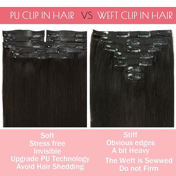 - 【New Design- ULTRA-THIN PU WEFT】Our Factory Use New Technology Press The Hair On The PU With Clips, Which Make the PU Clip in Hair Extensions More Comfortable,Lighter and Invisible Compared With Lace Weft Clip in Hair Extensions. The PU Design Make Your Scalp More Invisibly, Can Match Your Hair Perfectly. The Outside PU Part on Each Piece is Different Than The Inside PU Part,The Width of Outside is 0.5cm, The Width of Inside is 1cm.