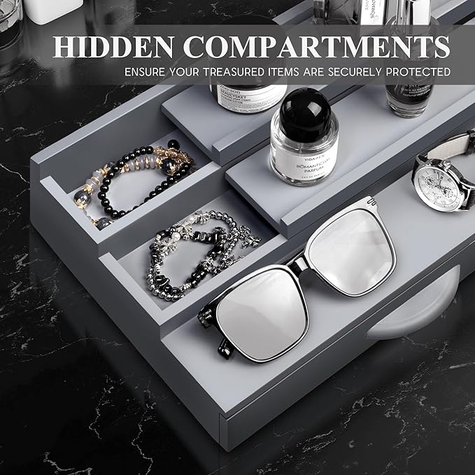- [HIDDEN STORAGE COMPARTMENTS] Keep your treasures safe! This men's cologne holder features two beautiful wooden lids with secret compartments inside. You can securely store your jewelry, cash, and other valuables, ensuring your most cherished items are well protected.