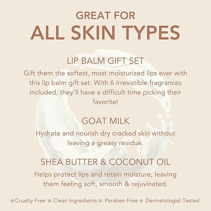 - Soothe, Protect & Moisturize - Our unique formula has beeswax infused with natural goat milk, shea butter, and coconut oil to repair chapped lips and keep moisture in. Unlike shiny lip glosses and lipsticks, our lip balm leaves lips feeling moisturized and looking naturally healthy without the gooey residue that other products leave.