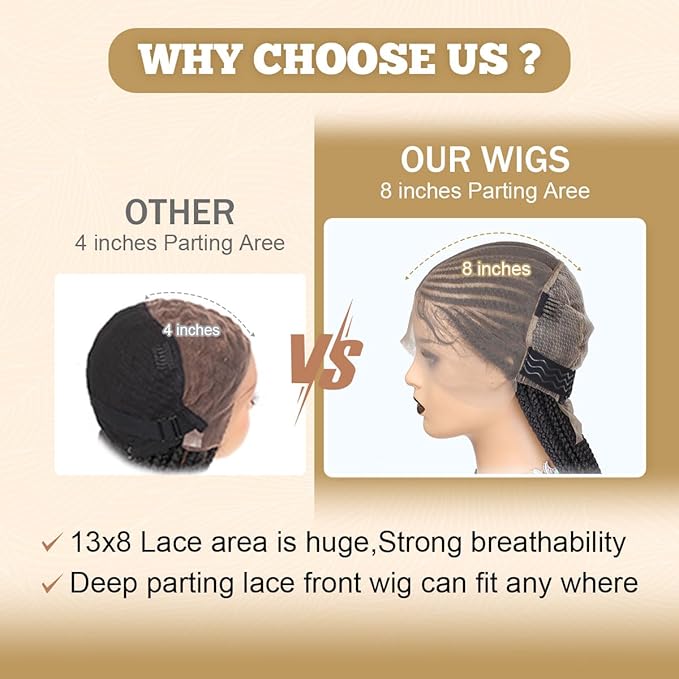 - 【Super Realistic Detail】:13x8 HD transparent front lace with half back double lace, that blends in so well that it looks like it's coming out of your scalp. You will receive many compliments on this box braid wig with baby hair.