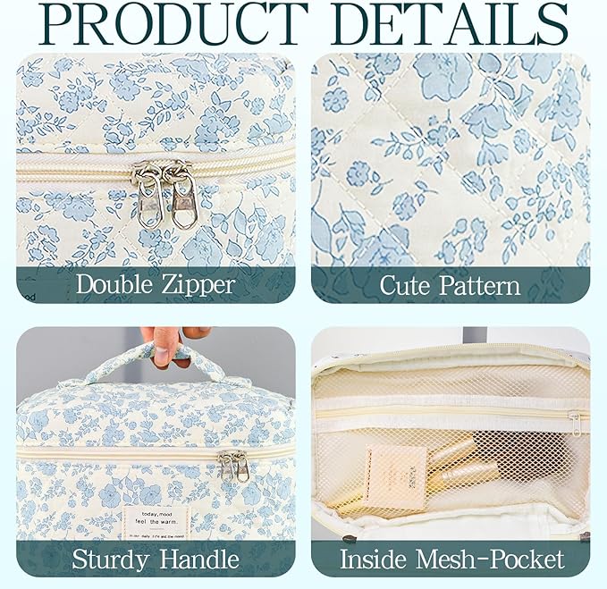 Makeup Bag, 3 PCS Quilted Makeup Bag, Cute Floral Cotton Cosmetic Bag set, Coquette Makeup Pouch Large Travel Toiletry Bag