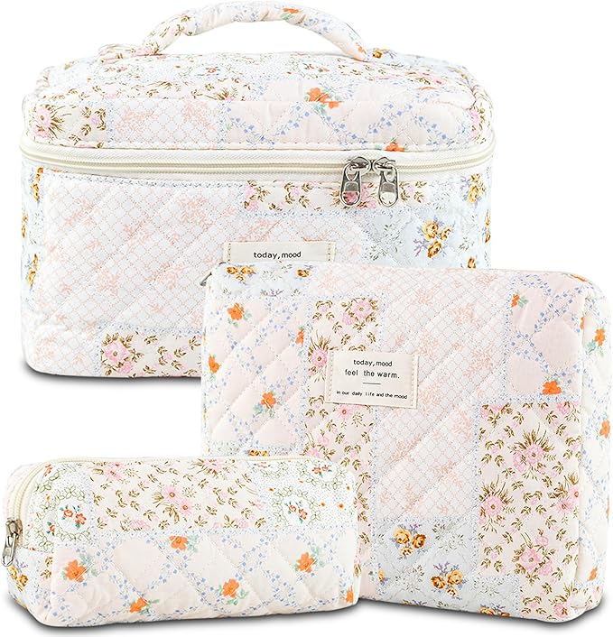 Makeup Bag, 3 PCS Quilted Makeup Bag, Cute Floral Cotton Cosmetic Bag set, Coquette Makeup Pouch Large Travel Toiletry Bag