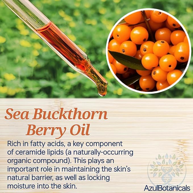 - Sea buckthorn berry oil, renowned for its rich antioxidant content and omega fatty acids, rejuvenates and nourishes the skin, promoting a youthful radiance.