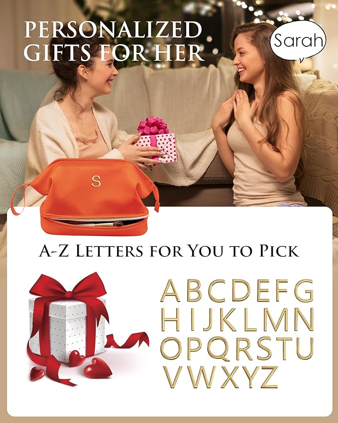Gifts for Girls, Initial Large Makeup Bag, Personalized Double Layer Cosmetic Bag with Makeup Brush Organizer, PU Leather Travel Toiletry Bag Gift For Daughter, Preppy Things For Girls