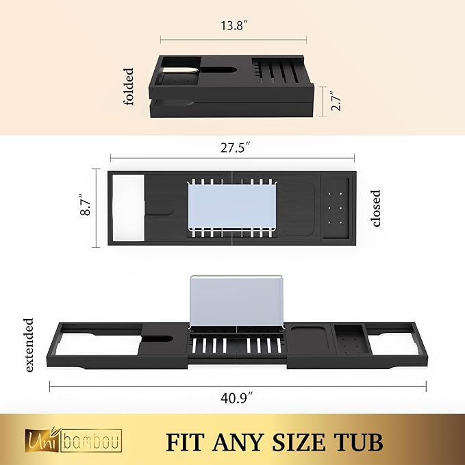 - đExpandable & Non-Slip - The bamboo bath tray has an expandable handle, which can extend 27.5" when closed and 41.2" when fully extended.