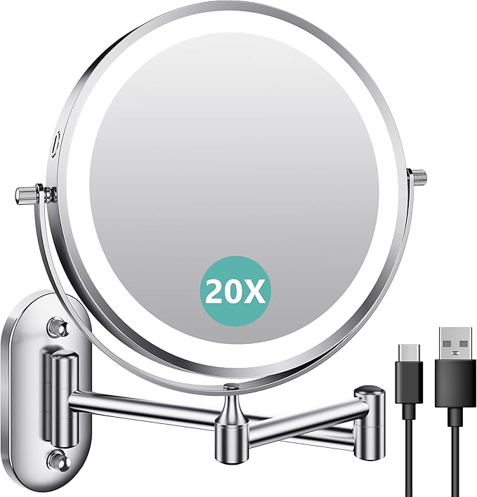 1X/20X Wall Mounted Makeup Mirror with Light, 8" Double-Sided Magnifying Mirror, 3 Color Lights Touch Dimmable Vanity Mirror with 360ยฐ Extension Rotation Foldable 14.5 Inch Arm for Bathroom, Chrome