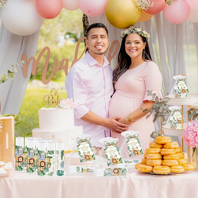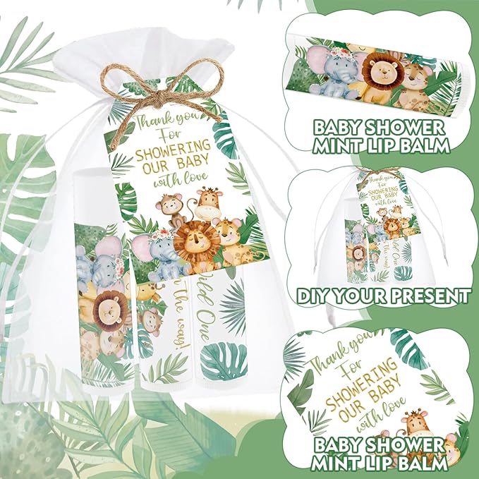- ♥〔Creative Design〕This baby shower favor lip balm is printed with jungle animals, which is a vibrant and interesting image.Our card tag is also printed with a clear "thank you" on it,the card tag is exquisite and beautiful, making it suitable for placing in organza gift bags