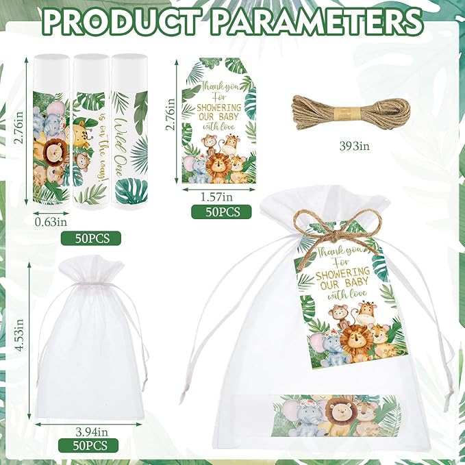 - ♥〔Comprehensive Package〕Our Jungle Animal Theme lip balm party favors include 50 lip balms, 50 organza bags and 50 thank you cards, adequate quantity can meet your gifting needs for baby shower or other parties
