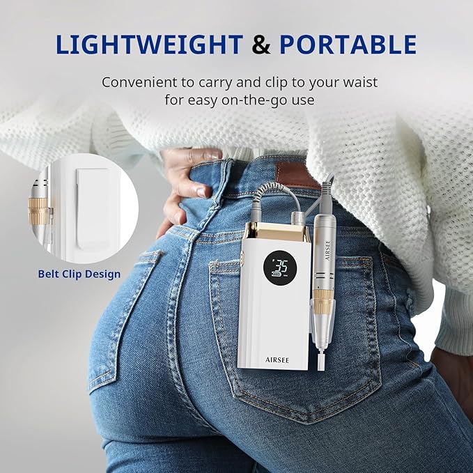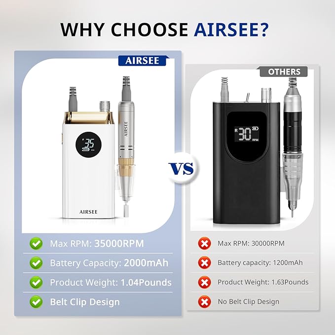 - Professional and Efficient:AIRSEE electric nail machine is designed for beginners and nail art enthusiasts. Quickly shape and remove products such as shaping artificial nails, smoothing calluses, polishing nails, cleaning cuticles and removing products