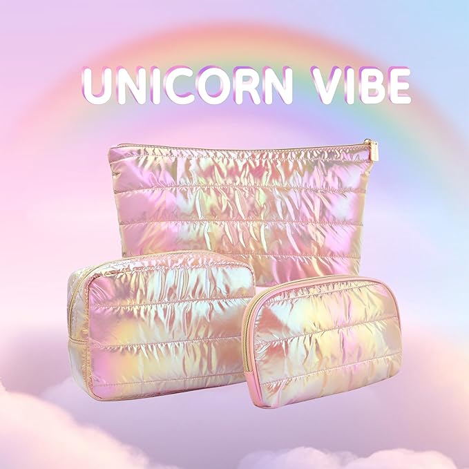 - 【Different Size】 The Iridescent puffer makeup bag set has 3 different size. Big size: 14 x 9 inches, medium size: 8 x 6 inches, small size: 8.5 x 5.5 inches. The large bag is ideal for holding all your essential cosmetics and skincare products and two small bags are perfect for organizing smaller items or travel essentials.