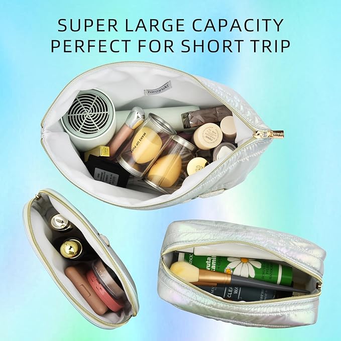 - 【Different Size】 The Iridescent puffer makeup bag set has 3 different size. Big size: 14 x 9 inches, medium size: 8 x 6 inches, small size: 8.5 x 5.5 inches. The large bag is ideal for holding all your essential cosmetics and skincare products and two small bags are perfect for organizing smaller items or travel essentials.