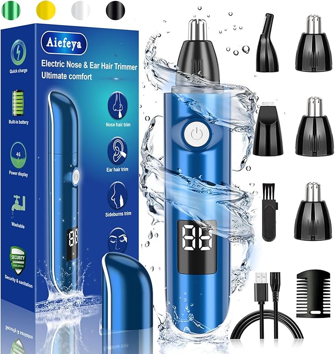 - 【Stylish & Multiple Accessories】The stylish appearance , excellent performance Aiefeya nose hair trimmer is your first choice for personal care. In addition, our nose hair remover is also equipped with a variety of accessories: Nose & Ear hair trim head × 3, Eyebrow trim head×1, Sideburns trim head×1, Eyebrow CombAttachment × 1, Cleaning brush × 1, USB charging cable × 1, Instruction manual×1.