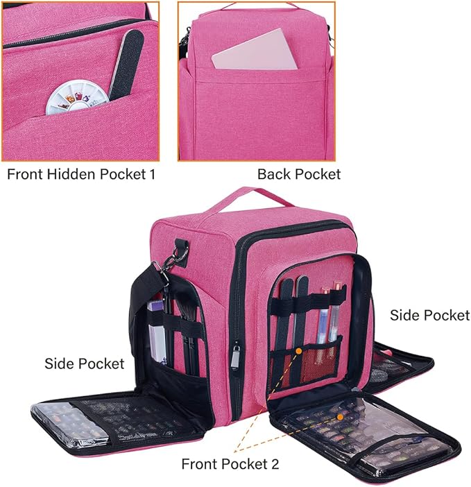 - Multifunctional pocket design - 2 side pockets and front pocket provide spacious space for other nail art tools. There are also adjustable shoulder straps and 1 sturdy handle, which is perfect for storing and transporting women's nail polish, cosmetics, essential oils and beauty kits