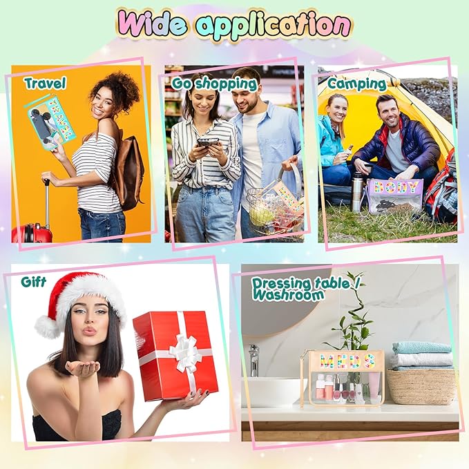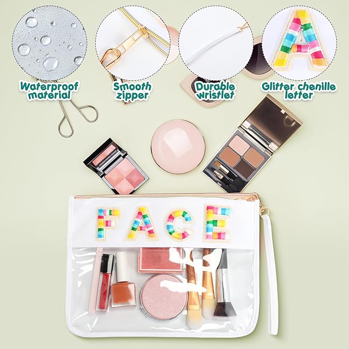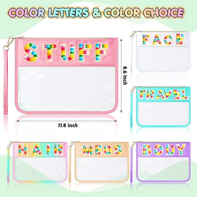 - Stylish Decoration with Chenille Letter Patches: the glitter letter clear zipper pouches are not only practical but also provide a nice decoration; Embellished with different chenille letter patches, including [TRAVEL] [BODY] [STUFF] [FACE] [HAIR] [MEDS], the snacks pouches boast an elegant touch that adds to their aesthetic appeal; The chenille design gives an athletic, vintage look, which is eye catching and trendy, ensuring that you stand out no matter where you are