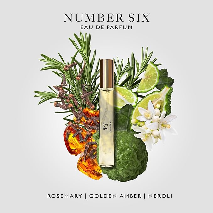 - Vibrant VI: Number Six embarks on a fragrant adventure with a bright opening of sparkling bergamot, rosemary, and neroli, let the initial notes pave the way for a warm, enveloping heart of rose, clove, and golden amber