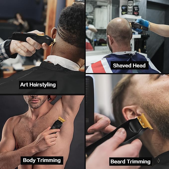 - ✨Adjustable Hair Clippers and Trimmers Kit: Adjustable taper lever offers the hair clippers precise hair cutting control (0.45-0.8 mm cutting length) for blending, fading & shaving and equiped with 6 metal guards (1.5/ 3/ 4.5/ 6/ 9/ 12mm) to meet your more haircutting styles. Besides, the zero gaped T blade trimmer can achieve 0.1mm close cutting for trimming, outlining & carving and also equiped with 3 trimmer guards (0.5 / 1/ 1.5mm) to meet your beard and more hairstyles need. ☛More various sizes of hair cutting length let your hairdressing journey more spontaneous.