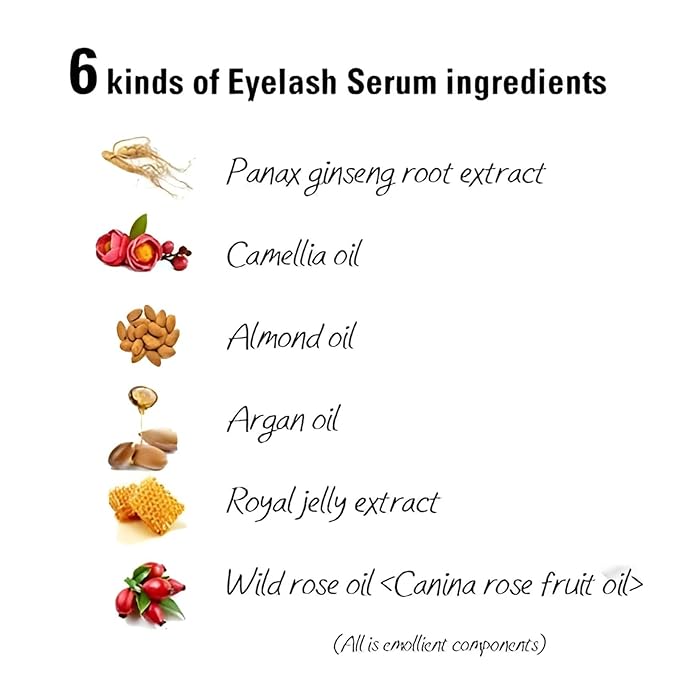 - 【Contain 6 Organic Eyelash Serum Ingredients】Argan Oil, Camelia Oil, Royal Jelly Extract, Wild Rose Oil, Panax Ginseng Root Extract, and Almond Oil. Eyelash treatment ingredients protect sensitive lashes from damage while wearing eye makeup.