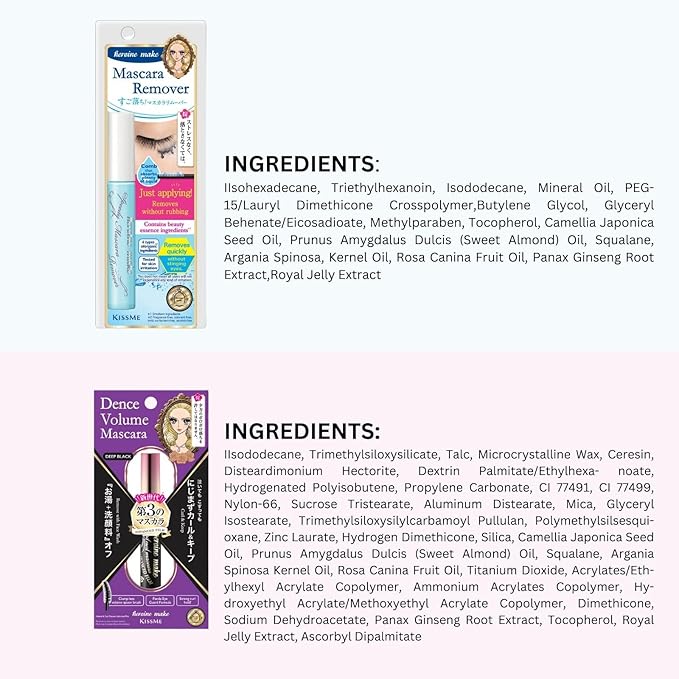 HEROINE MAKE by KISSME Mascara Duo Set | 2 Full-Size -Volumizing & Curl, Long-lasting False Eyelash Effect w/Curvy Brush Advanced Film 01 Jet Black + Gentle Eye Makeup Remover for Waterproof Mascara