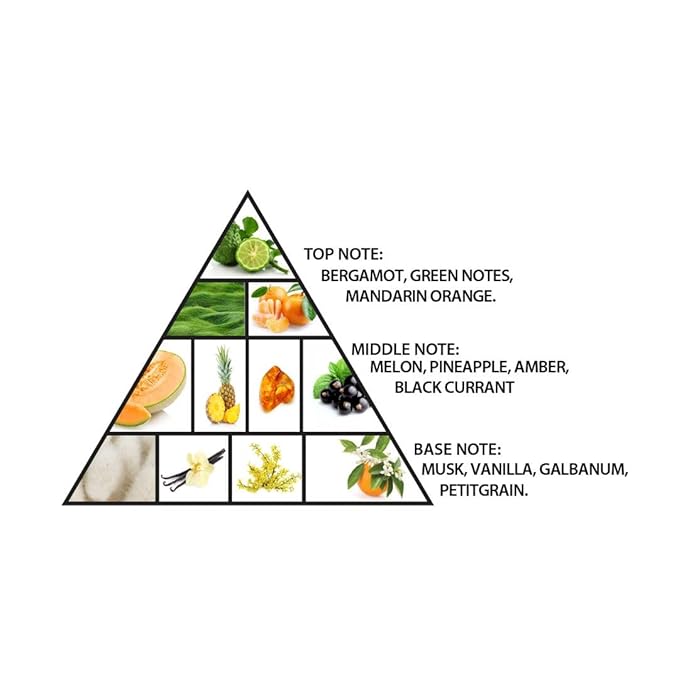 - Heart Notes - Amber, Melon, Black Currant, Pineapple ; Base Notes - Musk, Petitgrain,Galbanum, Vanilla.