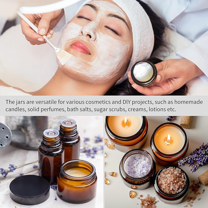 - Premium Quality: These 1oz amber glass cosmetic jars paired with black lids. Crafted from top-notch thick glass, each jar is built to last. The matching black lids feature inner liners for added convenience.