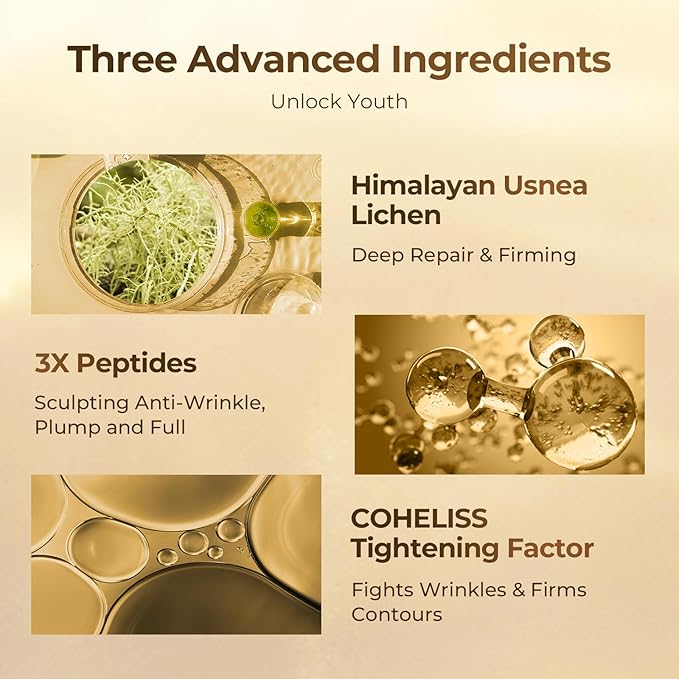 - Three Cutting-Edge Ingredients forRestoring Youthful Skin: A powerful blend of three advanced anti-aging ingredients. Himalayan Usnea Lichen deeply repairs and firms the skin. 3X Peptides help sculpt facial contours, smooth wrinkles, and enhance plumpness. COHELISS tightening agent targets deep lines, boosting skin elasticity and defining facial contours for a more youthful appearance.