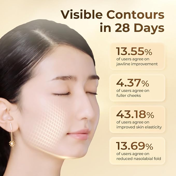 - Significant Contour Improvement in 28 Days: After 28 days of using this product, users commonly reported visible improvements in facial contours. According to data, 13.55% of users saw a jawline lift, 4.37% noticed fuller cheeks, 43.18% experienced improved skin elasticity, and 13.69% noticed a reduction in nasolabial fold.