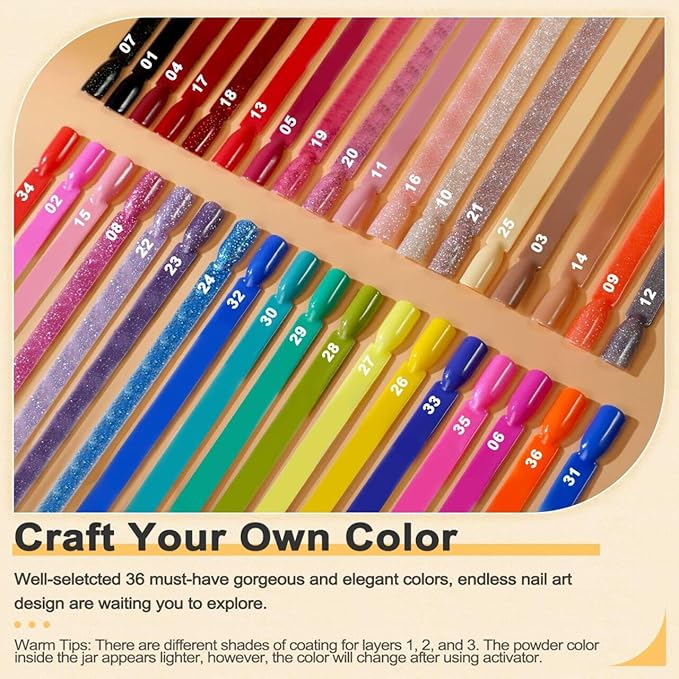 - All-in-One Dip Powder Nail Kit: Lavender Violets dip powder nail kit includes 36 dazzling glitter colors (0.34oz each), along with a complete dip powder liquid set—base coat, top coat, activator, and brush saver (15ml each). You also get dip manicure tools: cuticle pusher, nail file, nail brush, cuticle trimmer, cuticle oil pen, nail buffer, nail decal stickers, and a dip powder recycling tray.