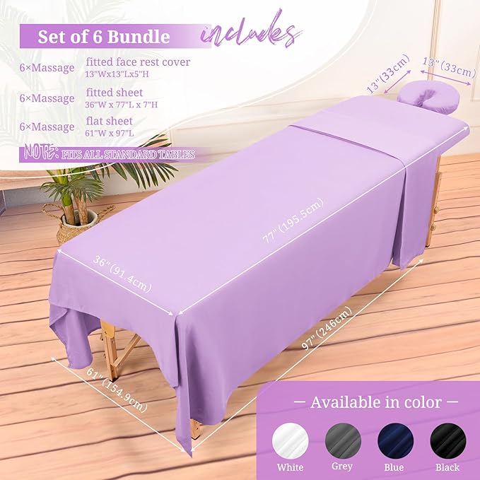 - 【Microfiber Massage Table Sheets Sets】:You will get set of 6 Light Purple massage table sheets sets, includes 6 pack fitted sheet 36"W x 77"L x 7"H, 6 pack flat sheet 63" W x 100" L and 6 pack face cradle cover 13" W x 13"L x 5"H.The soft material provides silky, breathable comfort for your clients.