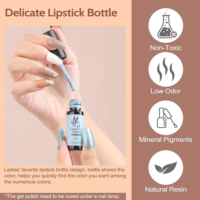 - One Set for All Nail Art: LAVENDER VIOLETS gel polish kit perfect for any season. You’ll find shades like black, white, red, pink, green, blue, and glitter. Made from non-toxic ingredients, our gel nail polish is safe and low in odor, allowing you to enjoy beautiful nails without worry. This versatile nail art kit complements any outfit, making it ideal for the office or a seaside getaway. With proper application, enjoy gorgeous nail art for 3–4 weeks.