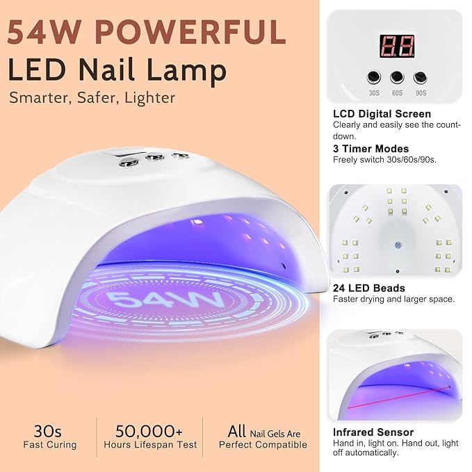 - Upgraded U V Nail Lamp: The gel nail kit with U V light includes a powerful 54W nail dryer that cures all U V and LED gel polishes quickly and evenly. The innovative infrared sensor activates the lamp automatically when you insert your hand, simplifying the curing process. With convenient settings of 30s, 60s, and 90s, you can easily touch up or thoroughly cure your nails. If you feel any discomfort, simply remove your hand and resume when comfortable, ensuring a pleasant experience with our gel nails kit with U V light.