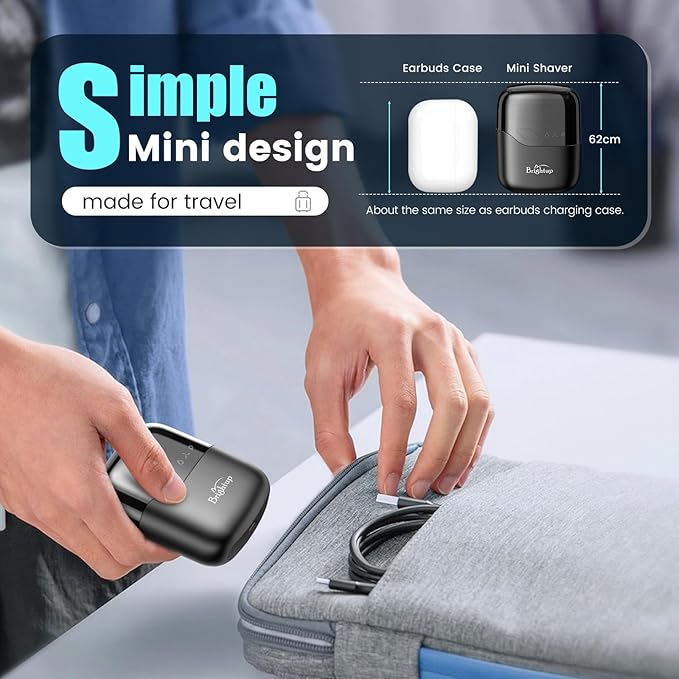 - Specifically Design for Travel: Brightup travel electric shaver is designed with a protective cap that also covers the power button as well so it will never turn on. Also, the USB Type-C makes it easier to charge it via your phone's brick or a power bank – the perfect tool to be a travel companion! Come with a mini storage bag, easy to store a mini shaver, and a USB-C cord, helping you travel light.