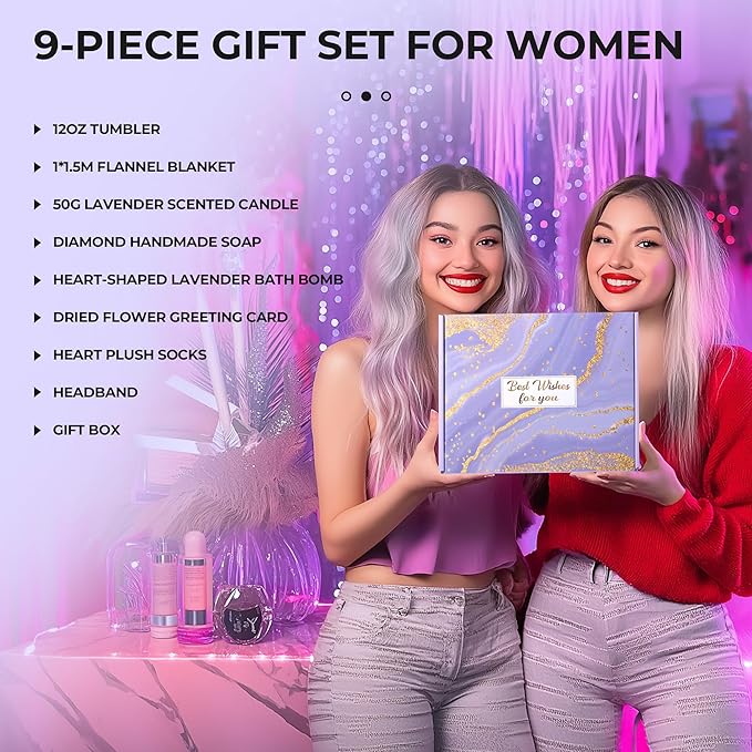 - 9-Piece Gift Set for Women: (1) 12oz Tumbler, (2) 1*1.5m Flannel Blanket, (3) 50g Lavender Scented Candle, (4) Diamond Handmade Soap, (5) Heart-Shaped Lavender Bath Bomb, (6) Dried Flower Greeting Card, (7) Heart Plush Socks, (8) Headband, (9) Gift Box.