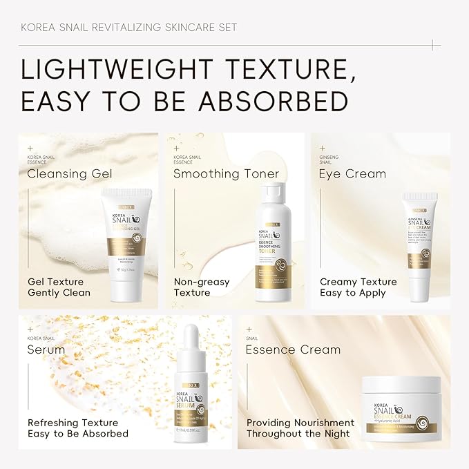 Korean Snail Essence Skin Care Kit,Skincare Gifts for Women,Include Gentle Cleanser,Toner,Eye Cream,Serum,Cream,Long-Lasting Moisturizing & Nourishing,Minimizes the Look of Wrinkles
