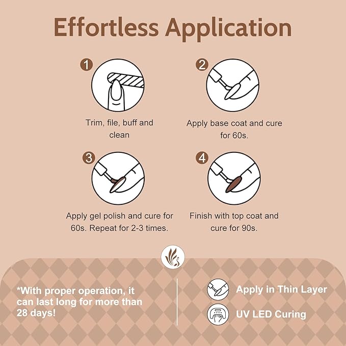- Long Lasting: Enjoy nail gel polish set, designed to provide durability. Experience chip-resistant nails that remain flawless for 28 days with daily use. Its formula ensures that your gel manicure maintains its vibrant color without breakage or peeling.