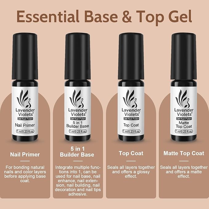 - Gel Polish Set: Lavender Violets presents the all-inclusive 49 Piece Gel Nail Polish Set, featuring 45 of Gel Colors, 1of Glossy No Wipe Top Coat, Matte Top Coat, Builder Base Coat, and Nail Primer.