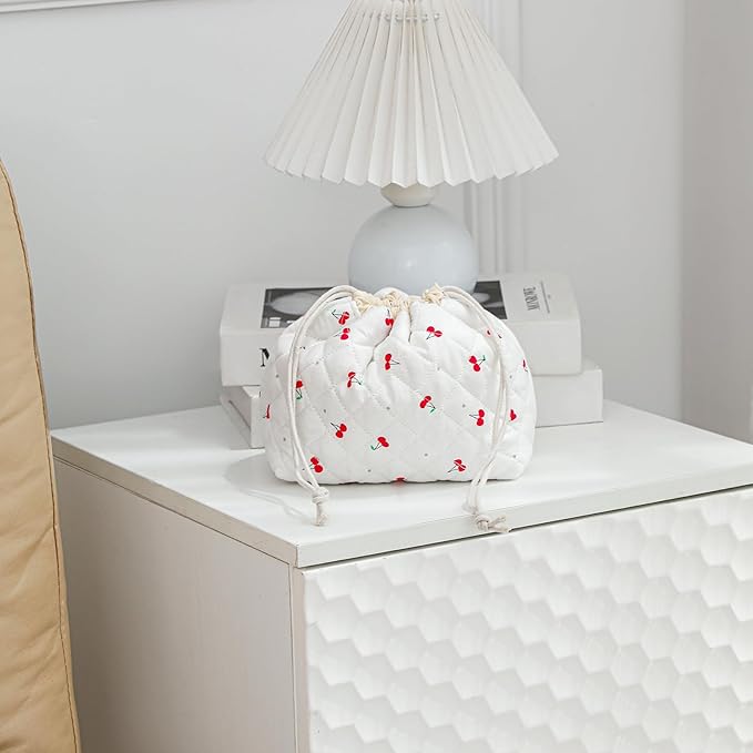 Cotton Quilted Drawstring Makeup Bag with Canvas Lining,Coquette Aesthetic Cute Travel Toiletry Bag,Drawstring Gift Bag for Women and Girls(01Cherry)