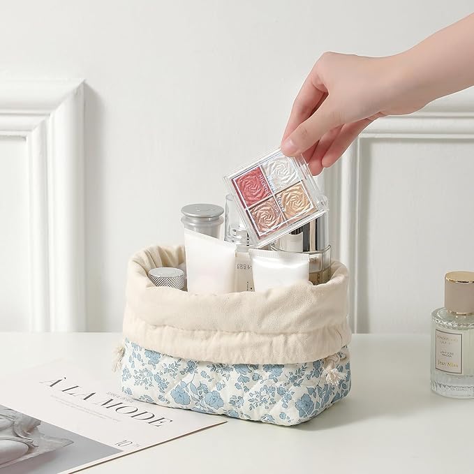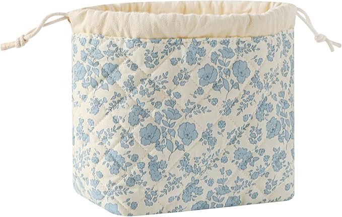 Cotton Quilted Drawstring Makeup Bag with Canvas Lining,Coquette Aesthetic Cute Travel Toiletry Bag,Drawstring Gift Bag for Women and Girls(02Light Blue Flower)
