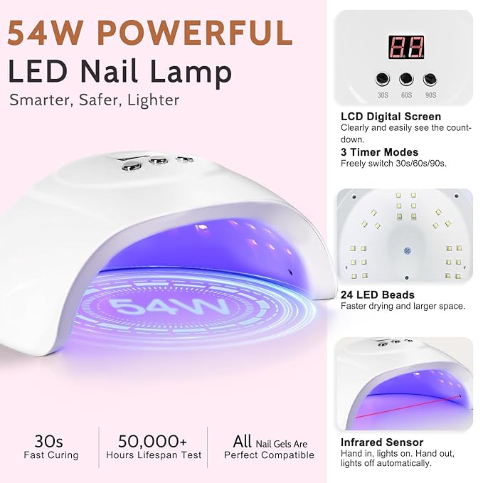 - Upgraded U V Nail Lamp: The gel nail kit with U V light includes a powerful 54W nail dryer that cures all U V and LED gel polishes quickly and evenly. The innovative infrared sensor activates the lamp automatically when you insert your hand, simplifying the curing process. With convenient settings of 30s, 60s, and 90s, you can easily touch up or thoroughly cure your nails. If you feel any discomfort, simply remove your hand and resume when comfortable, ensuring a pleasant experience with our gel nails kit with U V light.