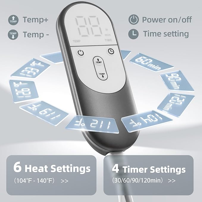 - Enhanced Safety Protocols: Your safety is our priority! The heating pad is equipped with an auto shut-off feature that activates after 2 hours, along with four timer options (30, 60, 90, or 120 minutes) to prevent overheating. Enjoy your heat therapy with peace of mind, knowing that safety and convenience are built into your experience
