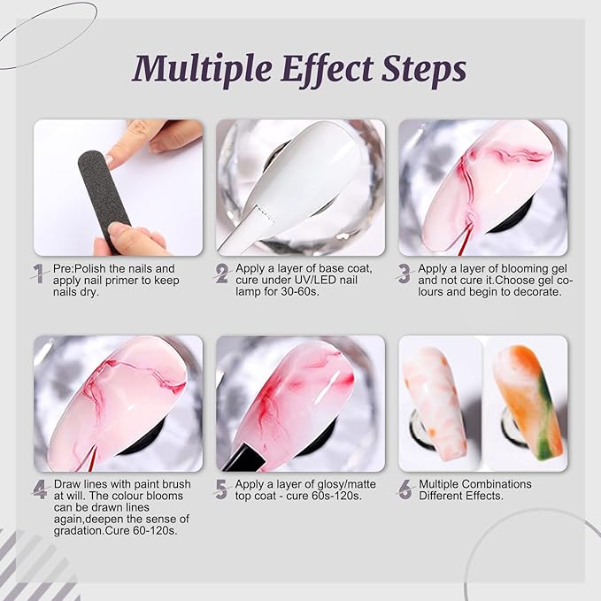 - Included Components : Glossy No Wipe Top Coat, Matte Top Coat, Base Coat, Blooming Gel