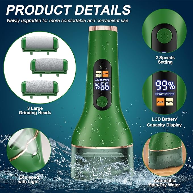 - 【IPX7 WATERPROOF -- AUTOMATIC SPIN-DRY WATER】Our dead skin remover foot grinder has IPX7 advanced waterproof grade, full body waterproof, dry and wet feet can be used, can be rinsed under the tap water; after cleaning, put it into the dust cover and press the starter switch can be automatically spin-dry water, easy to use, safe, the dust protection cover is designed with 2 small holes, so that the water is more easy to flow out, and at the same time increase the lifespan of the callus remover.