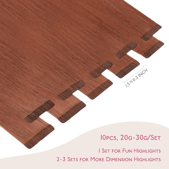 WENNALIFE Tape in Hair Extensions Human Hair Dark Auburn Copper Tape in Extensions, 10pcs 30g 24 inch Remy Invisible Tape Ins Straight Colored Soft Real Human Hair Tape in Extensions Refill Set Extens